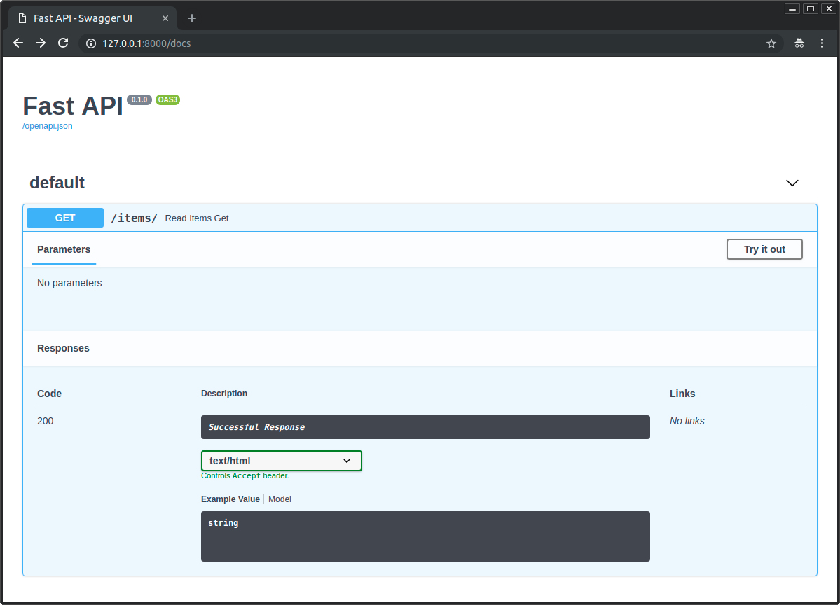 But as you passed the HTMLResponse in the response_class too, FastAPI will know how to document it in OpenAPI and the interactive docs as HTML with text/html: