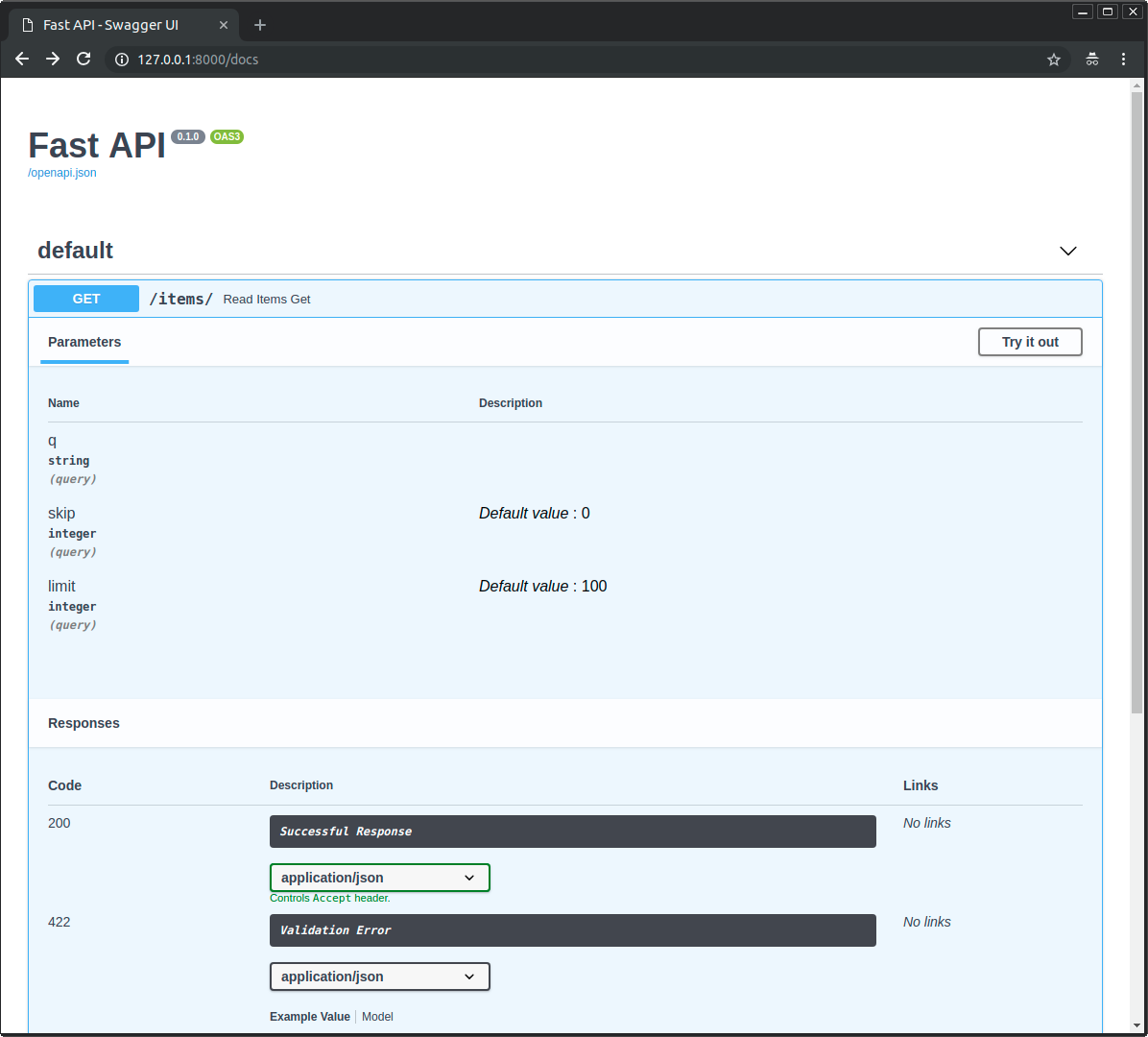 • An optional query parameter skip that is an int, and by default is 0.